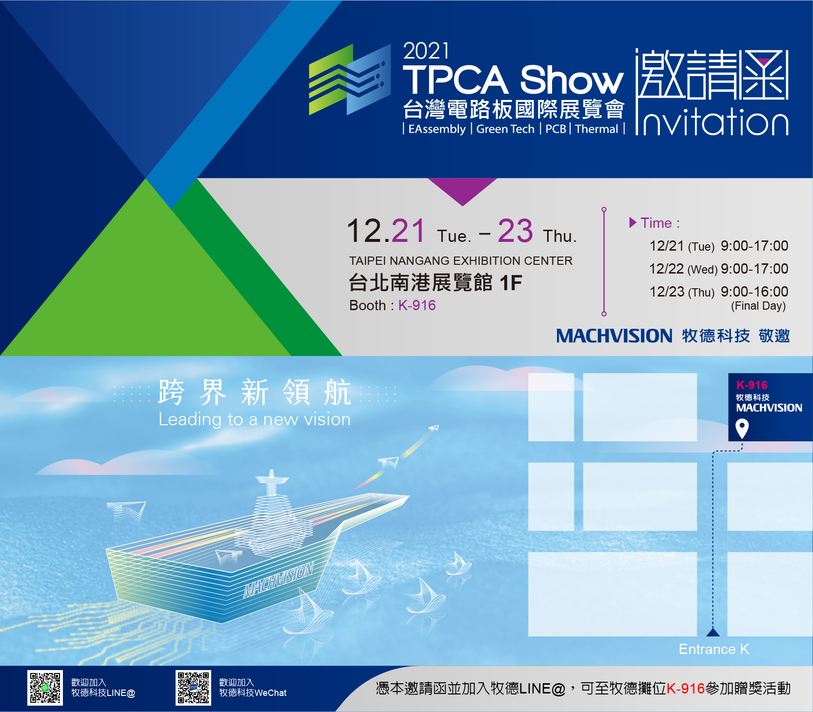 牧德科技將在12/21至12/23於台灣電路板國際展覽會 (2021 TPCA Show)參展,此次展會主題為「跨界新領航」,歡迎業界先進蒞臨指教。