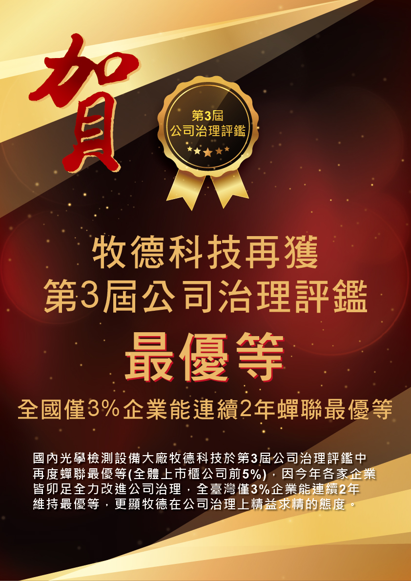 國內光學檢測設備大廠牧德(3563)於昨日公布的第3屆公司治理評鑑中再度蟬聯最優等(全體上市櫃公司前5%),因今年各家企業皆卯足全力改進公司治理,全臺灣僅3%企業能連續2年維持最優等,這樣的表現更顯牧德在公司治理上精益求精的態度。