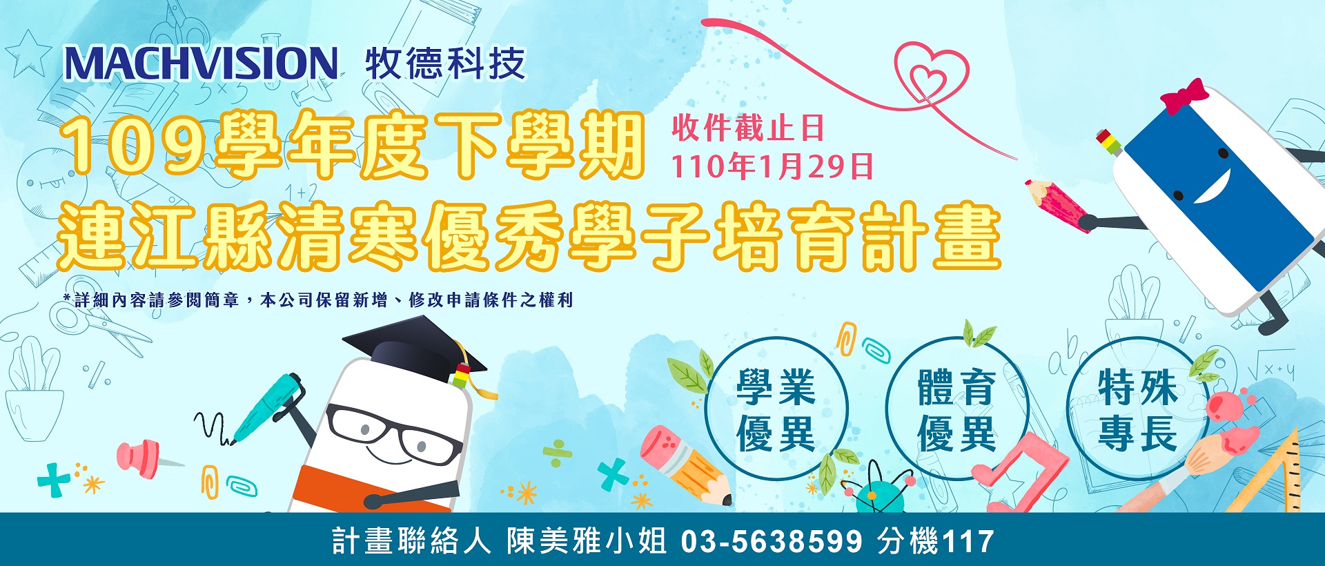 本公司為培育家境清寒或具特殊專長對未來有具體規畫之優秀學生,免受經濟因素影響,得以安心就學、發展專才,特提供獎助學金申請,申請程序詳如簡章,110年1月29日(五)收件截止。